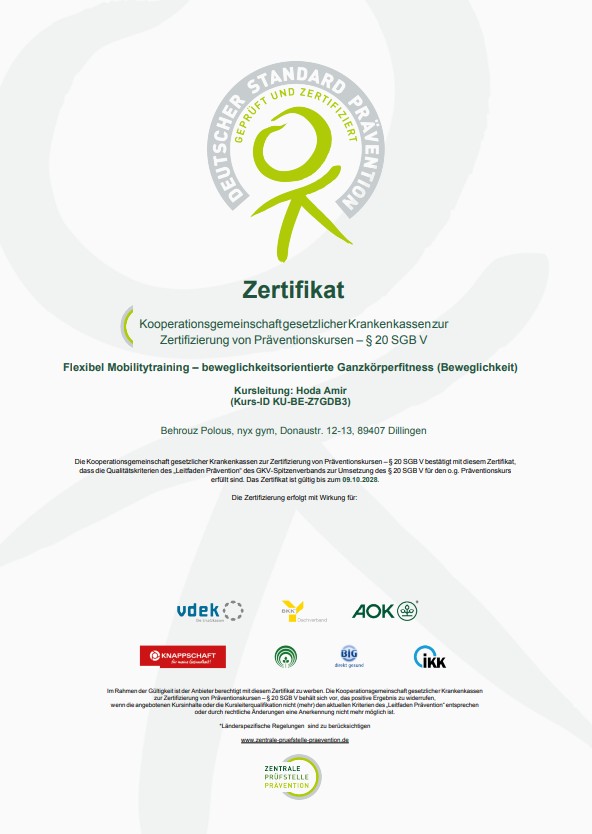 Sport war schon seit meiner Kindheit ein fester Bestandteil meines Lebens. Daher beschloss ich, meinen beruflichen Weg zu ändern und meine persönliche Begeisterung für Bewegung mit wissenschaftlichem Wissen zu vereinen. Das führte mich zu einem zweijährigen Masterstudium im Bereich Sporttherapie an der Universität Teheran, das ich erfolgreich abgeschlossen habe.In den zwei Jahren nach meinem Umzug nach Deutschland habe ich diesen Weg konsequent weiterverfolgt: Bereits sechs Monate nach meiner Ankunft gründete ich mein eigenes Studio und absolvierte parallel mehrere Ausbildungen mit Bestnoten: