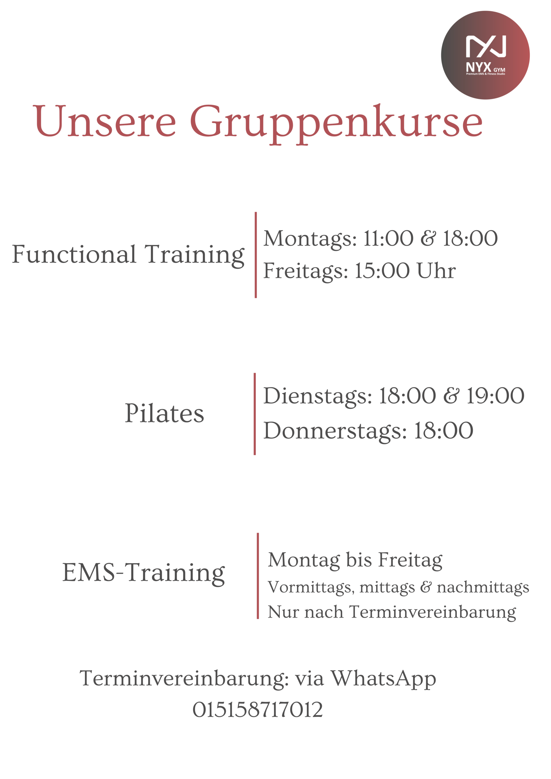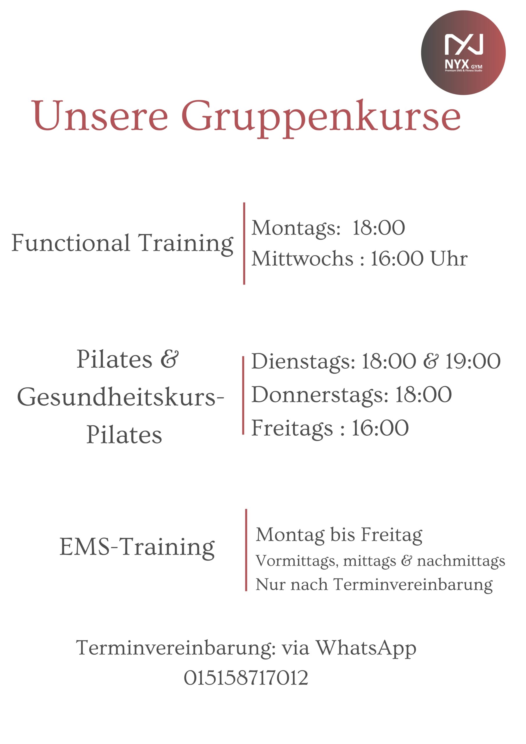 Unsere Gruppenkurse finden an festen Tagen und Uhrzeiten statt und werden in kleinen Gruppen von max. 6 Teilnehmern durchgeführt – alle Kurse werden von unserer Trainerin professionell betreut.